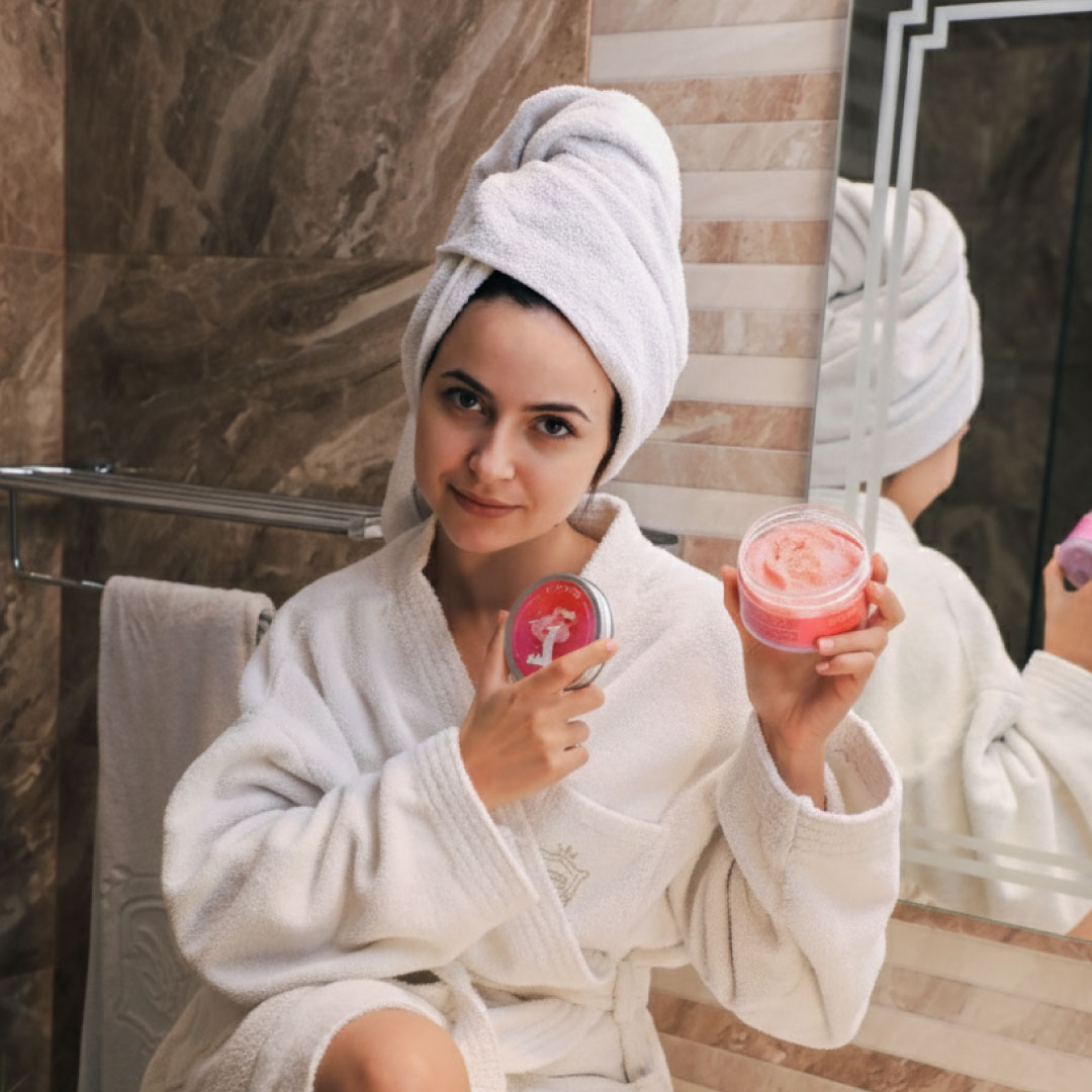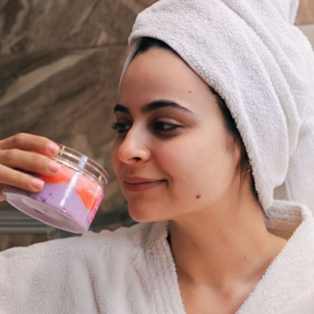 Choisissez un lieu apaisant , allumez des bougies, et mettez une musique douce. Moulliez votre peau, puis appliquez le gommage en effectuant des mouvements circulaires. Savourez la texture exfoliante , les couleurs et parfums envoûtants du gommage.
