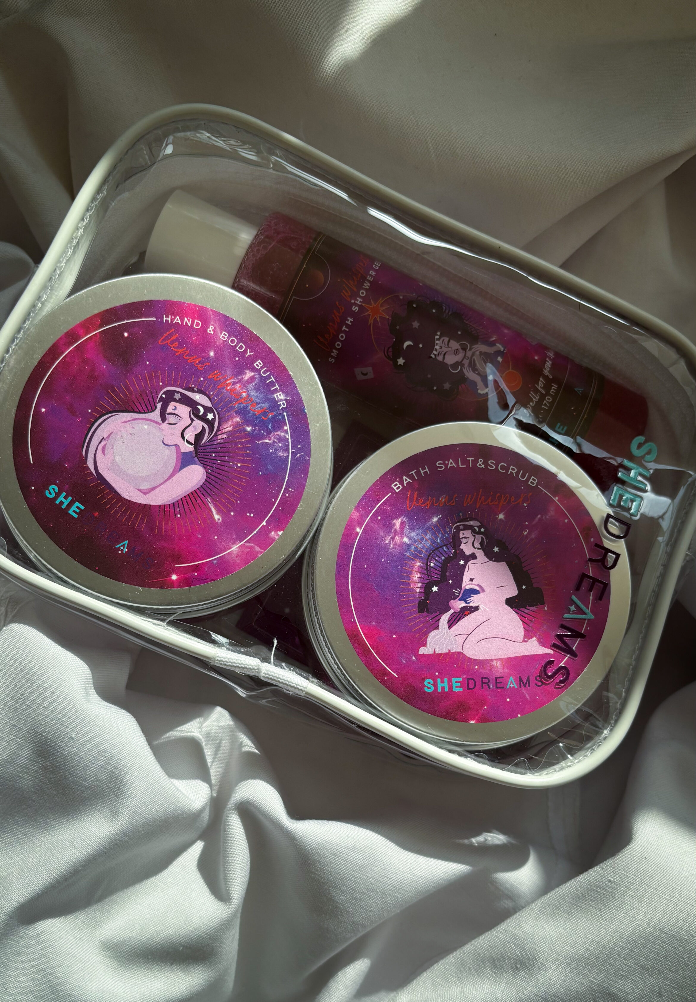 Plongez dans un monde de tendresse et de douceur avec la Trousse Venus Whispers, un cocon de bien-être conçu pour sublimer chaque moment de votre quotidien. Offrez-vous ou offrez à une âme chère un instant d’évasion, où la féminité et l’amour de soi se mêlent délicatement à chaque geste.